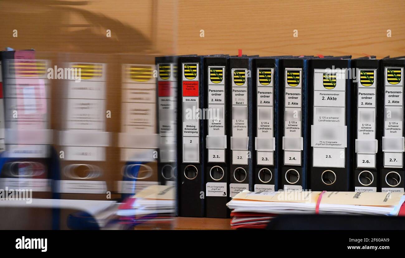 Dresden Germany 29th Mar 2021 Files Stand On A Table At The Beginning Of The Trial Against Members Of The Group Faust Des Ostens At The Dresden Regional Court The Men Are